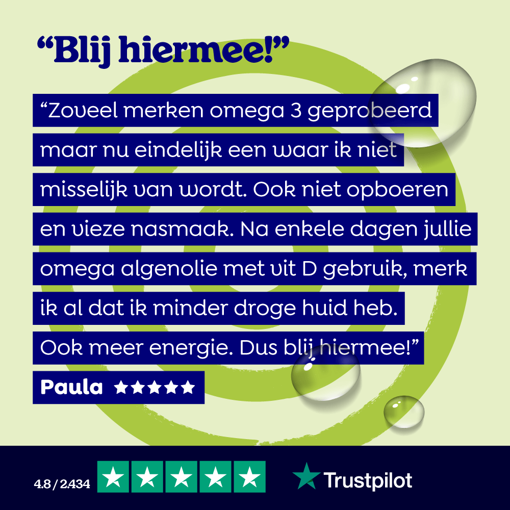 Olie gemaakt van algen, is de enige olie op aarde die dezelfde Omega-3 vetzuren EPA en DHA bevat als visolie. Dat is niet zo gek als je bedenkt dat vette vissoorten afhankelijk zijn van het eten van algen of het eten van kleine visjes die algen hebben gegeten. De smaak van de olie leent zich voor gebruik in bijv. yoghurt, maar ook om zo van de lepel te nemen. Geen kans op vissmaak of oprispingen.