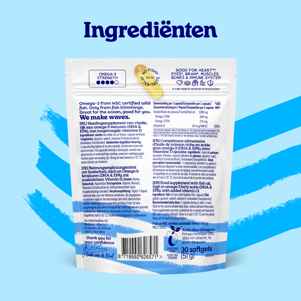 De hoge dosering DHA en EPA maakt dat de dagelijkse inname van één capsule al goed is voor het hart*, het gezichtsvermogen** en de hersenfunctie**. Daarnaast zorgt de vitamine D3 dat inname goed is voor de botten, het immuunsysteem en de spierfunctie.