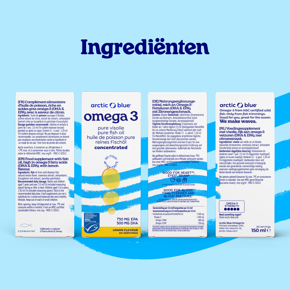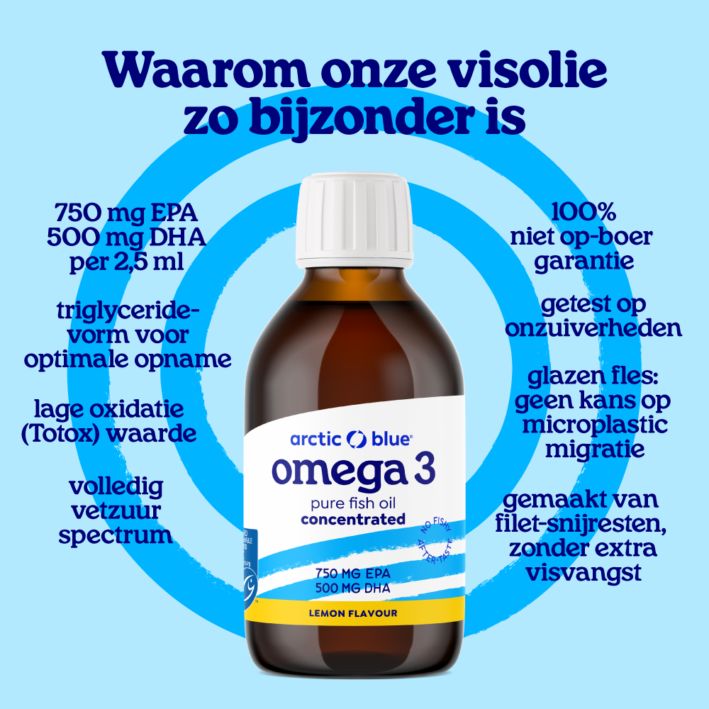 Wilde vette vis, zoals haring, sardientjes of makreel, is een hele goede bron van waardevolle onverzadigde vetzuren Omega-3 EPA en DHA én van vitamine D. Magere vis daarentegen (kibbeling, vissticks, tilapia en pangasius) bevat deze belangrijke voedingsstoffen nauwelijks. Pure Arctische MSC Visolie met vitamine D is er voor iedereen die moeite heeft met vette vis. De dagdosering (2,5 ml) (één dessert- of koffielepel) Pure Arctische Visolie bevat de Omega-3 vetten van (omgerekend) ongeveer één hele haring. Het is wetenschappelijk bewezen dat deze hoeveelheid EPA en DHA goed is voor het hart**, goed is voor je gezichtsvermogen* (helpt om scherp te blijven zien) en goed is voor je hersenfunctie*. Het gunstige effect wordt verkregen bij een dagelijkse inname van 250 mg DHA* of 250 mg EPA/DHA**. Dit zijn wettelijk goedgekeurde gezondheidsclaims. Maar liefst 20% van het vet in onze hersenen bestaat uit Omega-3 DHA; het is een belangrijke bouwsteen voor hersenen (zoals calcium dat is voor de botten). De vitamine D in de visolie is belangrijk voor het behoud van sterke botten en sterke tanden. Vitamine D zorgt mede voor een goede weerstand en speelt een rol bij het behoud van sterke spieren. Het is wetenschappelijk bewezen dat EPA en DHA ook goed zijn voor de bloeddruk 1 en de triglyceriden 2 (bloedvetten) spiegel. Het gunstige effect wordt verkregen bij een dagelijkse inname van 3000mg 1 en 2000mg 2 EPA/DHA. De dagelijkse inname van EPA en DHA mag dan niet meer dan 5000 mg bedragen.